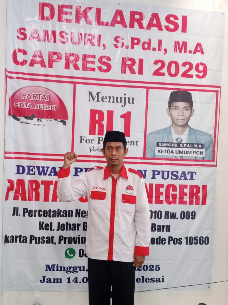 Jakarta –Peta politik nasional menuju Pemilihan Presiden 2029 mulai menunjukkan pergerakan signifikan. Pada Minggu, 27 April 2025, Partai Cinta Negeri (PCN) secara resmi mendeklarasikan pendiri sekaligus Ketua Umumnya, Samsuri, S.Pd.I., M.A., sebagai Calon Presiden Republik Indonesia Periode 2029–2034.