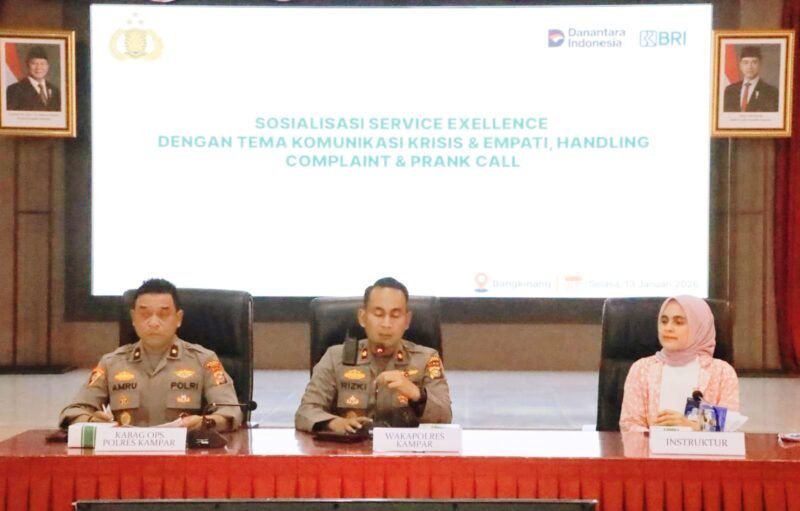 Kampar-Riau, – Polres Kampar terus berupaya meningkatkan kualitas pelayanan kepada masyarakat. Salah satu upaya yang dilakukan adalah dengan menggelar sosialisasi Service Excellence yang bekerja sama dengan Bank BRI Cabang Bangkinang, Selasa (13/01/2026) di Aula Sanika Satyawada Polres Kampar.