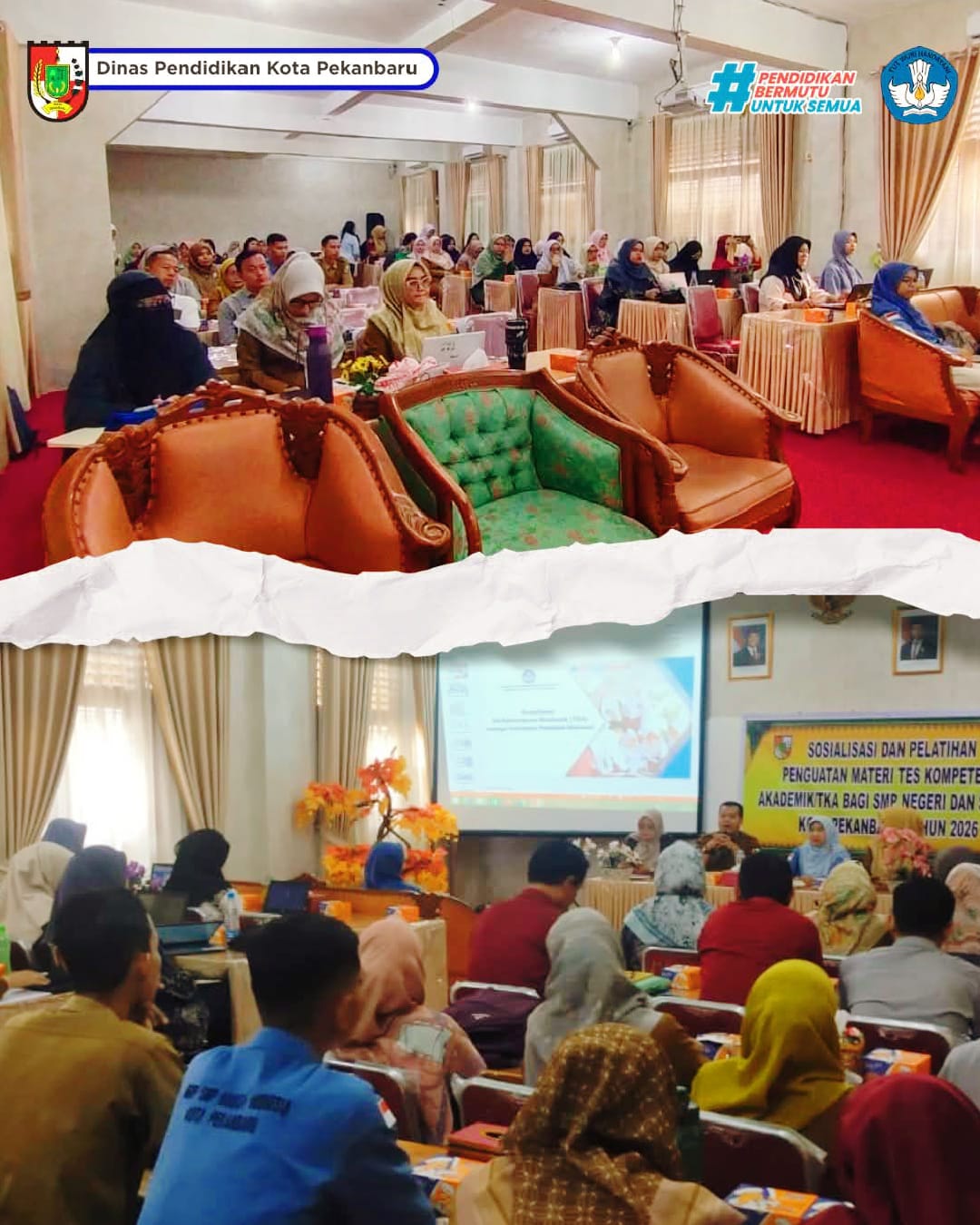 Pekanbaru, – Kepala Bidang SMP, Dr. Irpan Maidelis, S.Pd., M.M., didampingi oleh Kasi Kurikulum SMP, membuka kegiatan Sosialisasi dan Pelatihan Penguatan Materi Tes Kompetensi Akademik (TKA) bagi guru Bahasa Indonesia dan Matematika SMP Negeri dan Swasta Kota Pekanbaru. Kegiatan ini dilaksanakan di SMPN 1 Pekanbaru pada Selasa, 20 Januari 2026.